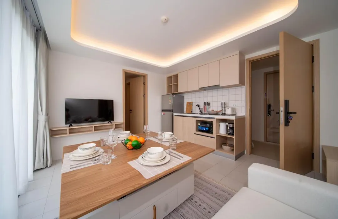全新二卧公寓现代风格的客房设有设施齐全的厨房。厨房备有冷冻机 和烤面包机。 Intercontinental Kamala公交车站距离公寓有10分钟的路程。 客人可以游一游,然后在私人游泳池旁边休息。
